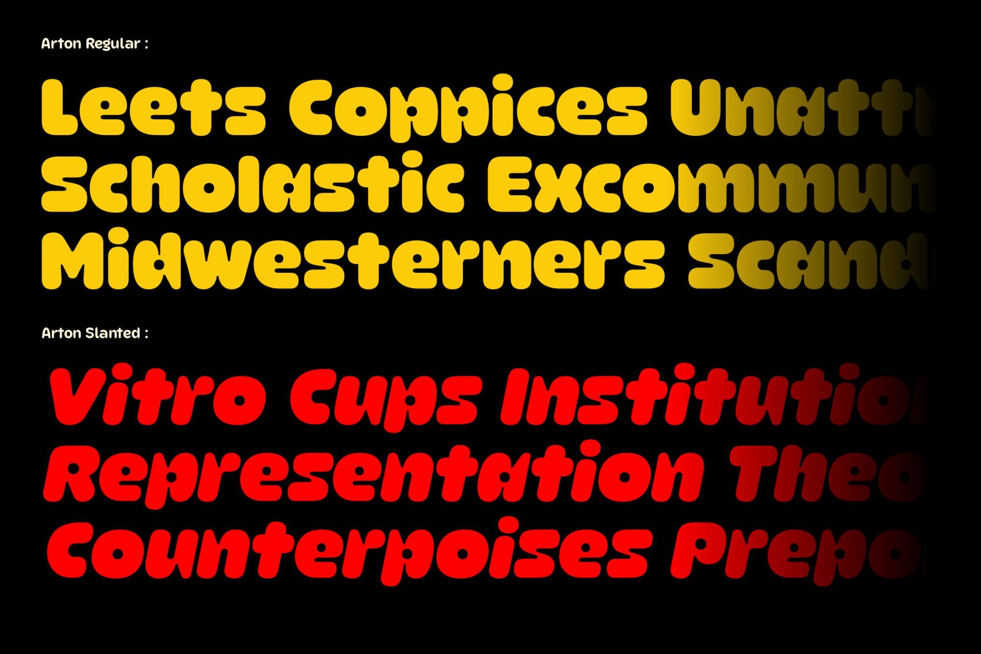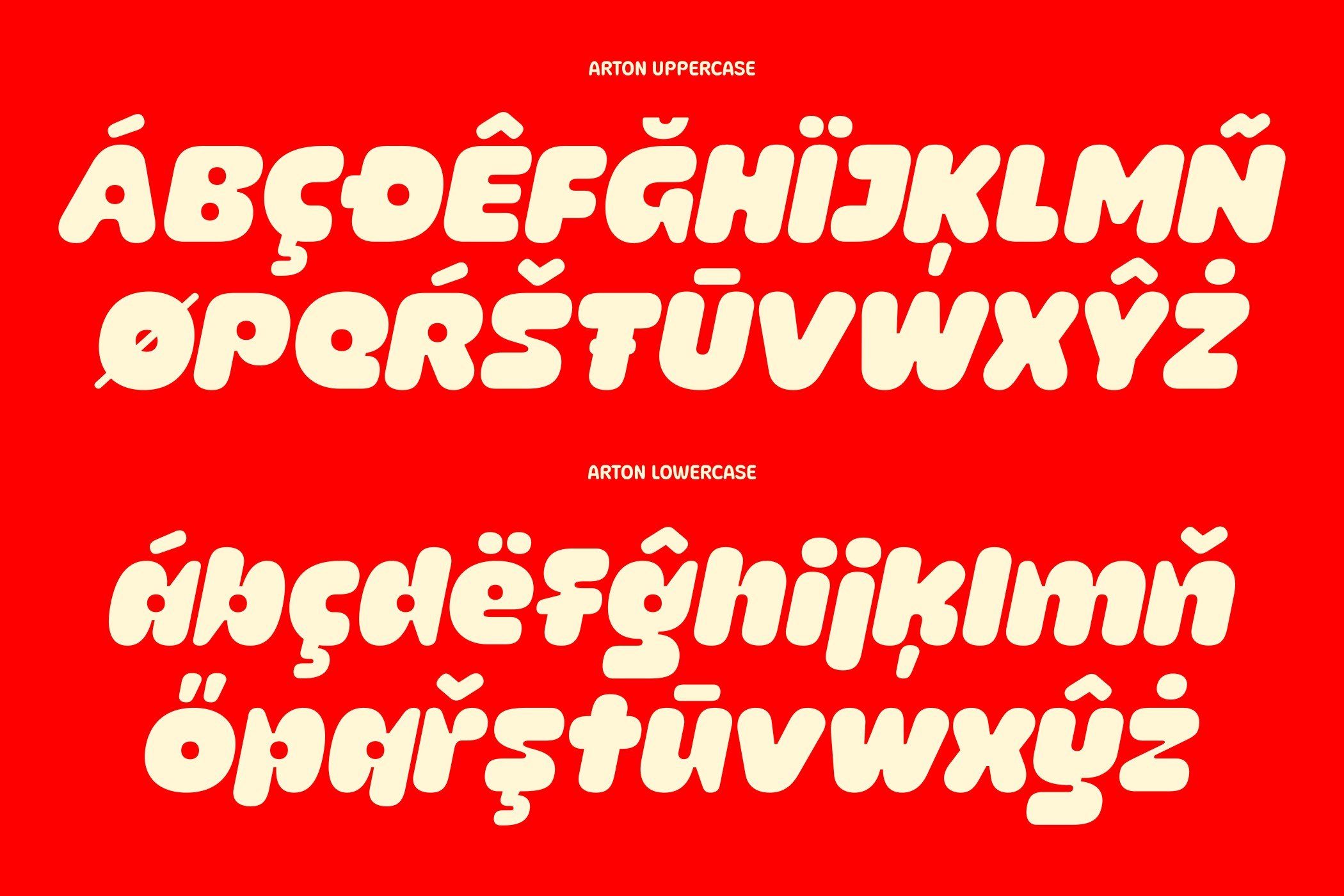Arton is a bold rounded display font designed to bring warmth, fun, and personality to your typography. Its smooth curves and chunky shapes create a friendly, playful look that instantly catches attention while staying clear and readable.