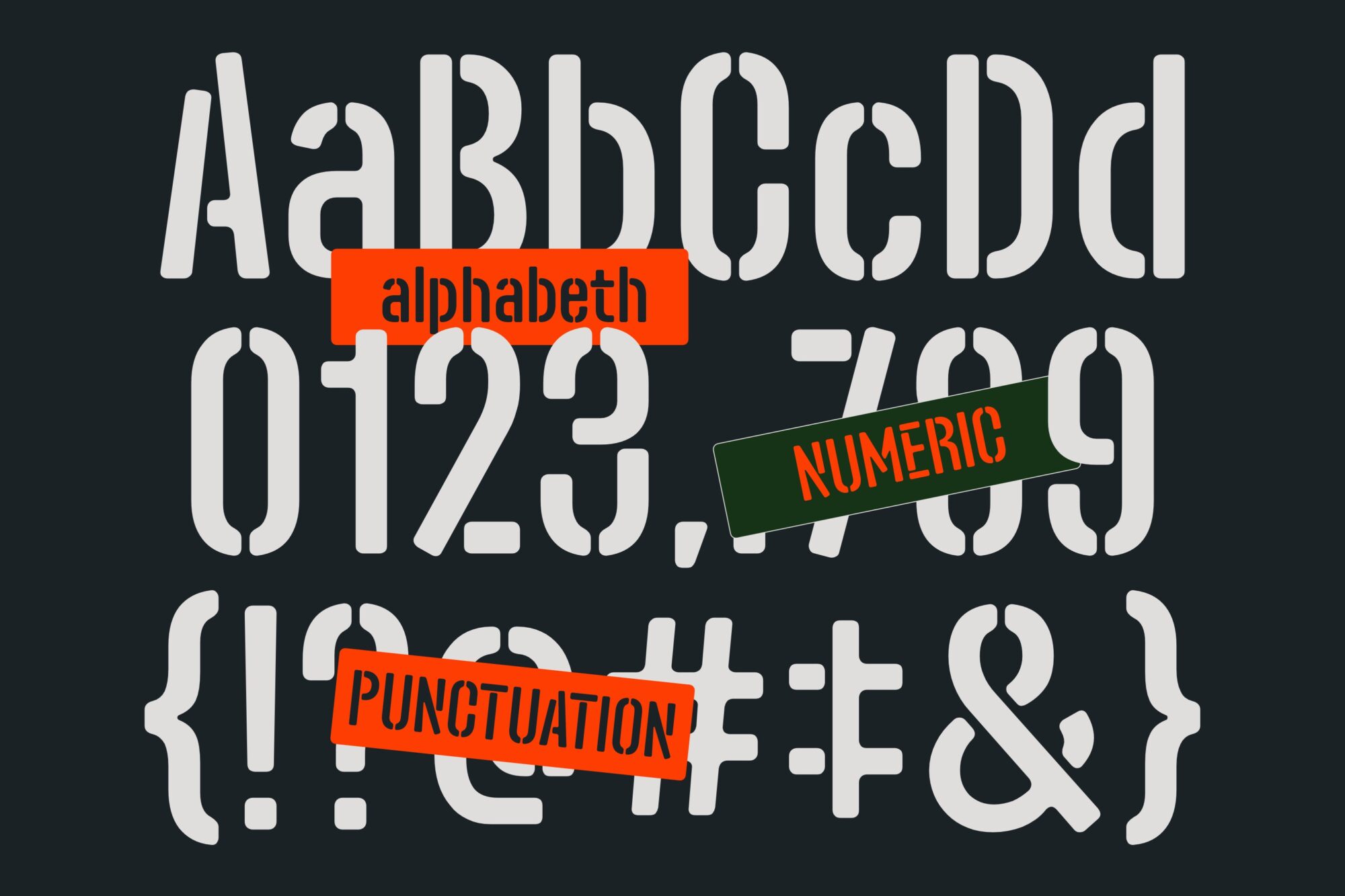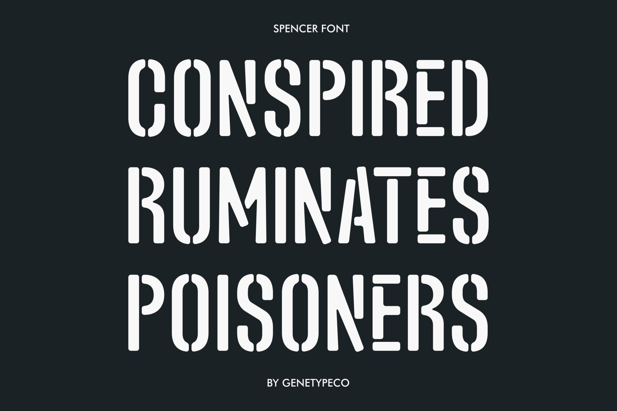 Introducing Spencer Font, a bold and distinctive stencil typeface that merges industrial design with contemporary aesthetics. Inspired by the rugged utility of stencil lettering, Spencer features robust strokes and clean cuts that lend it a strong presence on any surface. Perfect for projects seeking a blend of modernity and ruggedness, this font is versatile for branding, posters, and signage. Spencer delivers a unique visual impact while maintaining legibility, making it an excellent choice for projects that demand a bold statement.
